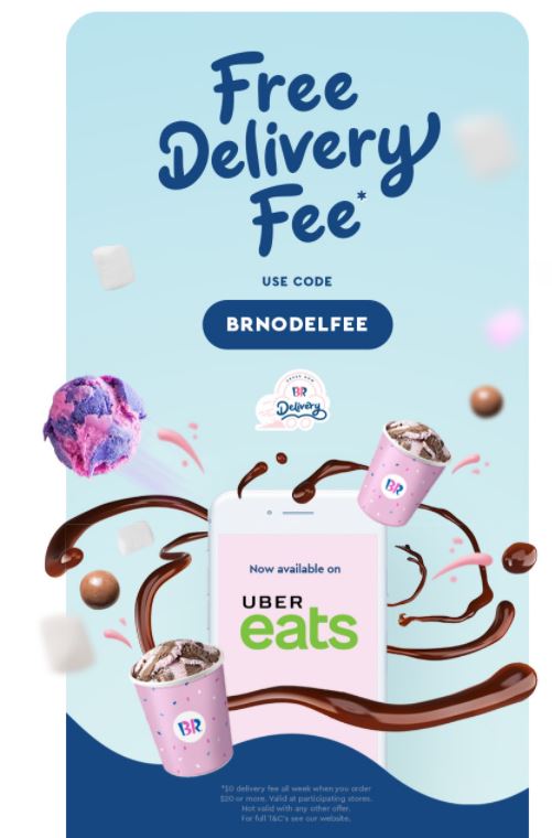 DEAL: Baskin Robbins – Free Delivery via Uber Eats on Orders above $20 (until 18 October 2020)