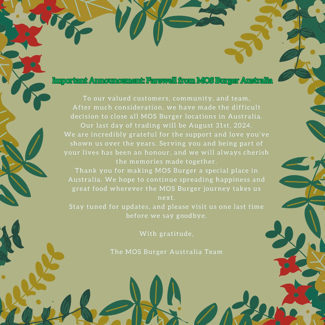 After much consideration, we have made the difficult decision to close all MOS Burger locations in Australia. Our last day of trading will be August 31st, 2024.