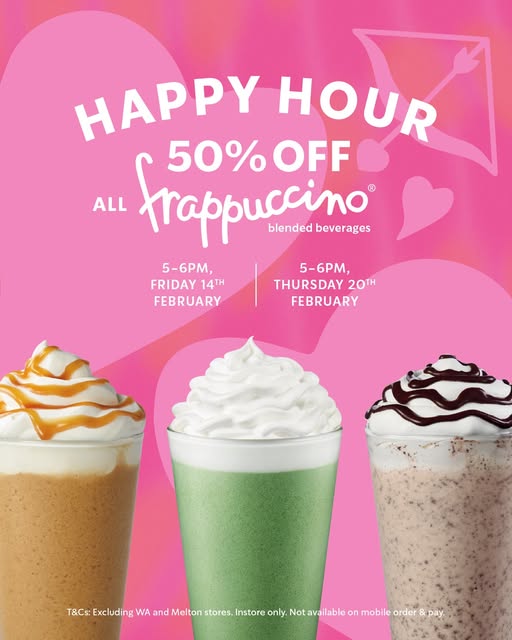 From 5-6pm Friday 14 February and Thursday 20 February 2025, Starbucks are offering 50% off Frappuccinos!