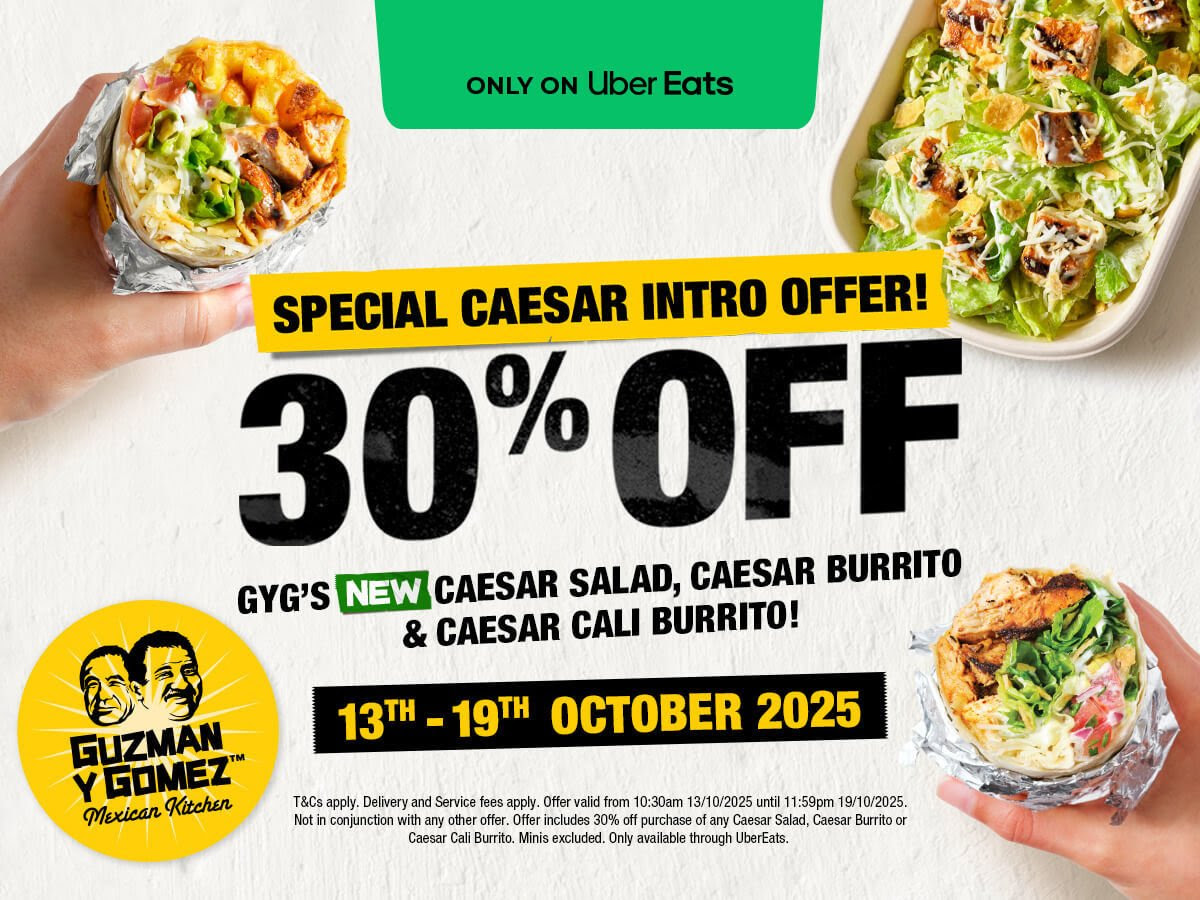 Guzman y Gomez (GYG) has launched a new limited-time offer on Uber Eats, giving customers 30% off Caesar Salad, Caesar Burrito, and Caesar Cali Burrito orders. The promotion runs from Monday, 13 October to Sunday, 19 October 2025, perfect for those who prefer to enjoy their Mexican favourites from home.