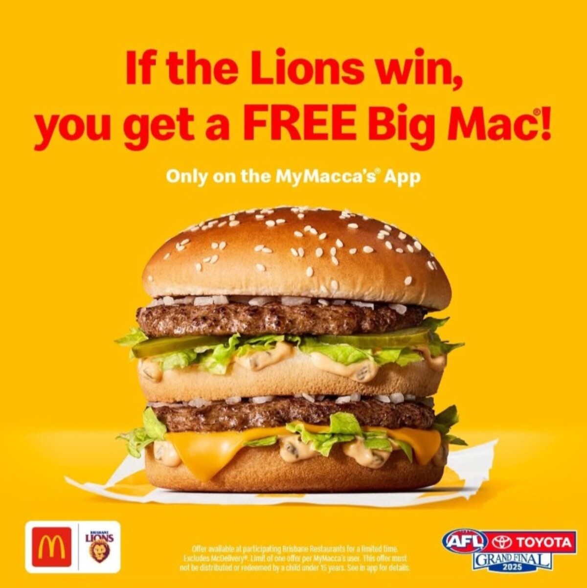 The free Big Mac promotion is valid until Friday, 3 October 2025, giving Brisbane fans several days to claim their burger following their team’s premiership win.