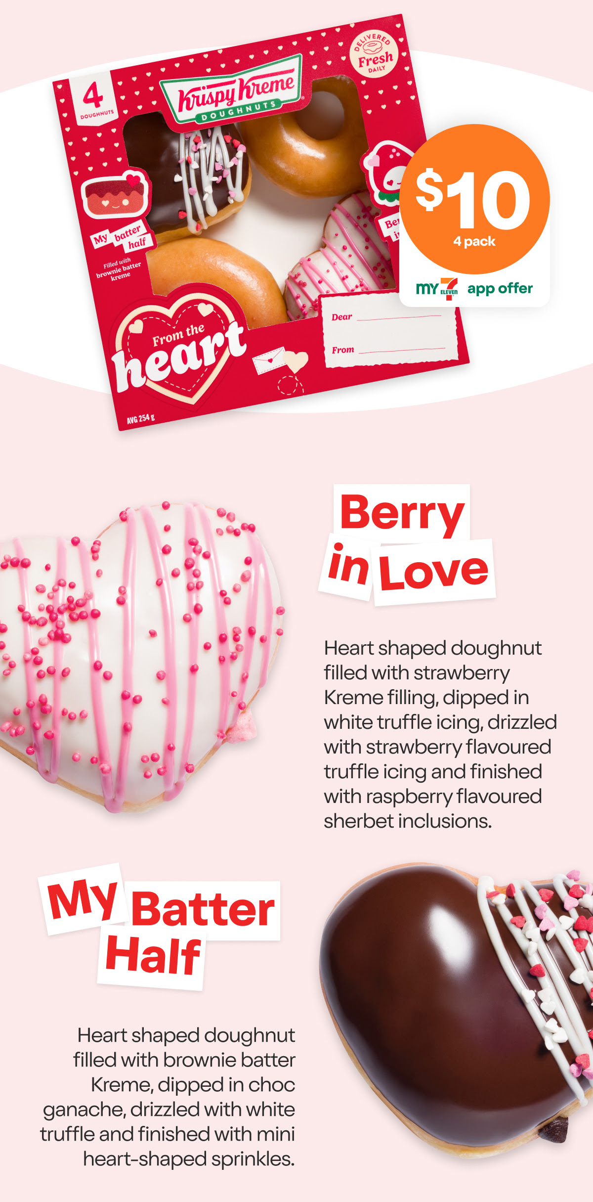 Krispy Kreme is spreading the love this February with the limited-edition “From The Heart” doughnut 4-pack, available exclusively on February 6, 2026. Priced at $10, this offer includes a pair of Original Glazed® doughnuts and two heart-shaped Valentine specials: Berry in Love and My Batter Half. The deal is available in-store and via 7NOW delivery, but only to My 7-Eleven app members.