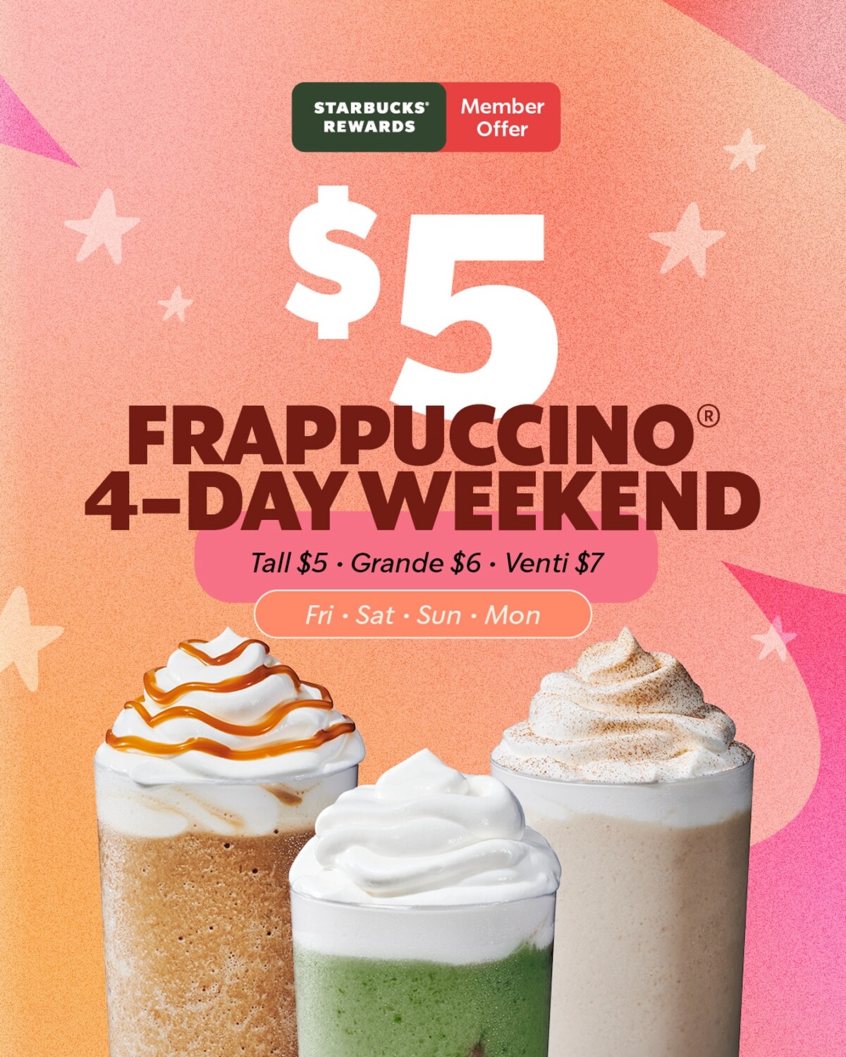 Starbucks $5 Frappuccino Weekend Runs 6 to 9 March 2026 4Starbucks Rewards members can enjoy discounted Frappuccino drinks during a limited four-day promotion running from 6 March to 9 March 2026. The offer reduces the price of Frappuccino beverages across multiple sizes, giving members a lower-cost way to order one of the brand’s most popular cold drinks.